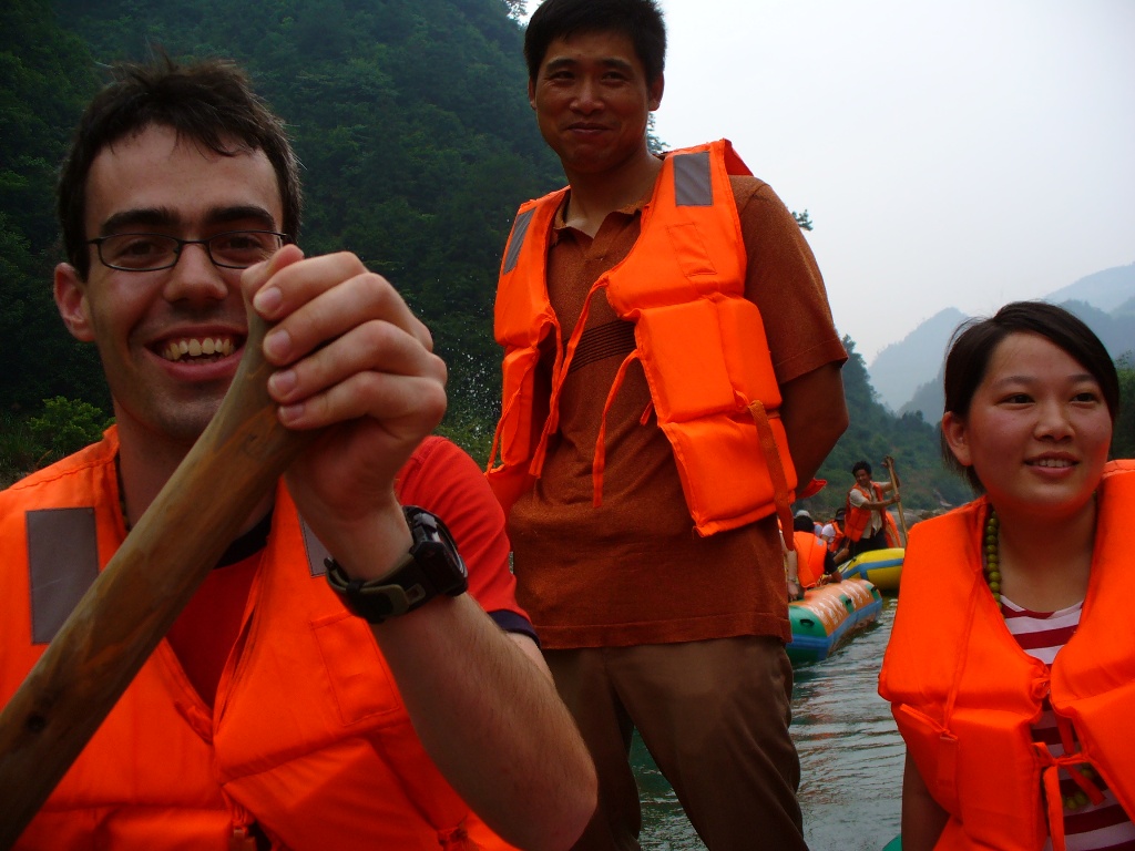 Nachmittags sind wir in das nun nur noch 30km entfernte Tal Zhexi Daxiagu gefahren. Dort gings dann mit nem Mianbao Che = Brotauto (schmaler hoher Minivan) weiter ins Tal. Wir stoppten an den Sehensw?rdigkeiten und genossen den Wasserfall und das herumklettern auf den Felsen im Flusslauf. Dieses Tal war wundersch?n und wir waren uns einig, dass sich der Aufwand dort hin zu gelangen gelohnt hat. Auch das Wildwasserfahren mit dem Schlauchboot war lustig, obwohl wir uns mehr Wildwasser erhofft hatten.